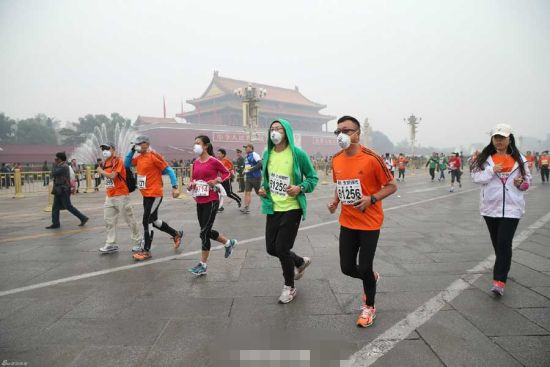 10月19日,2014年北京國際馬拉松賽如期舉行。霧霾再次襲來,當(dāng)天的PM2.5指數(shù)達(dá)300多,不少參賽者戴上了各式各樣的高倍防護(hù)口罩?!氨M量用鼻子呼吸”的提醒、戴口罩跑馬拉松的反差,引發(fā)人們的深切思考。